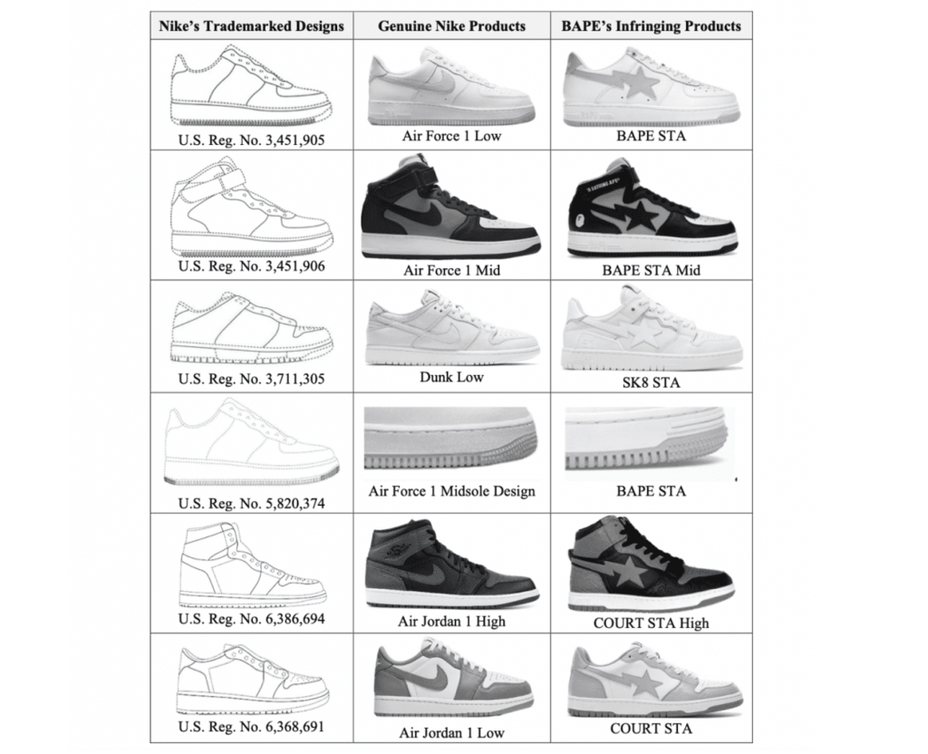 Some background: Nike filed suit against BAPE in January 2023, alleging that while BAPE first introduced infringing footwear in the U.S. in 2005, for most of that time, BAPE’s infringement was “de minimis and inconsistent,” and thus, did not warrant litigation. It was not until 2021 that the company began to escalate its infringement scheme, prompting Nike to wage trademark claims on the basis that BAPE sneakers infringe its Air Force 1, Air Jordan 1, and Dunk sneaker designs, according to Nike.