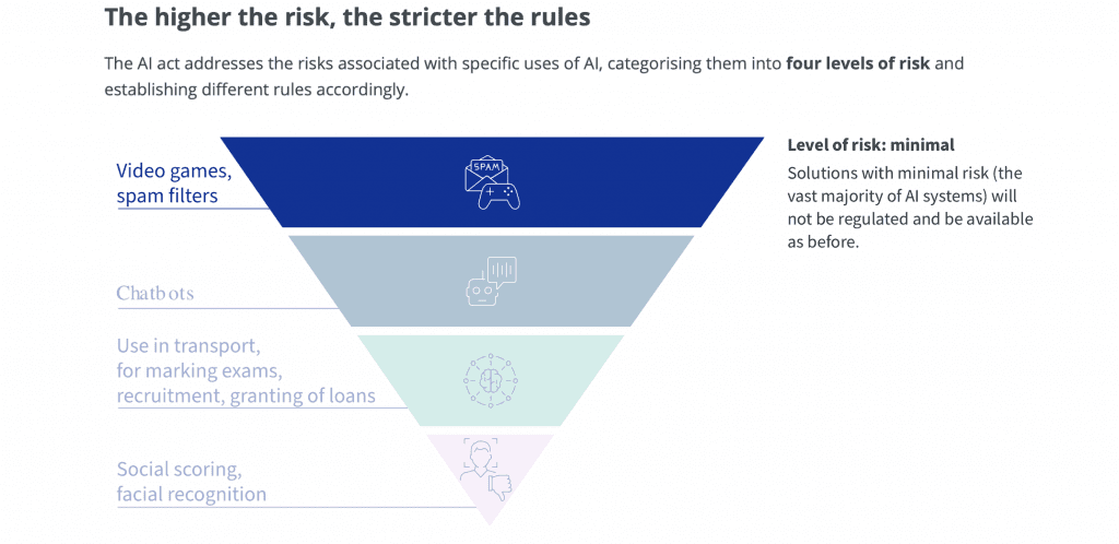 (1) Minimal risk: The vast majority of AI systems fall into the category of minimal risk. Minimal risk applications – such as AI-enabled recommender systems or spam filters – will benefit from a free-pass and absence of obligations, as these systems present only minimal or no risk for citizens’ rights or safety.