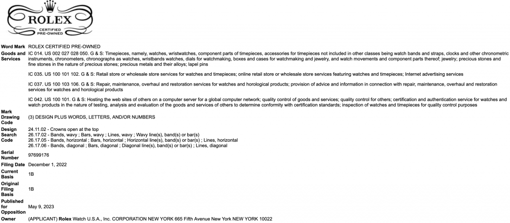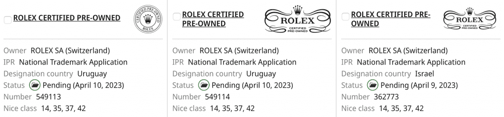 Here are a few of the marks that Rolex is using (and filing applications for registration for) in connection with the Certified Pre-Owned venture …