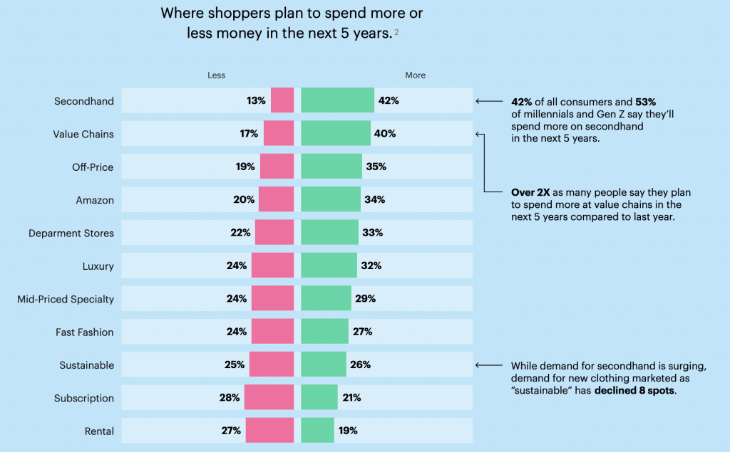 In one of its most striking observations, the resale giant’s report states that over the next 5 years, consumers are slated to prioritize secondhand apparel over new clothing that is marketed as “sustainable.” In this vein, 42 percent of consumers say that they plan to spend more on secondhand clothing versus the 26 percent that plan to spend more on new “sustainable” wares, as well as those marketed as “inclusive” and “transparent,” which is 40 percent fewer than 2019. This interesting shift is likely a reflection of the cost difference between pre-owned clothing and “sustainable” wares, the latter of which tend to be quite a bit more expensive.