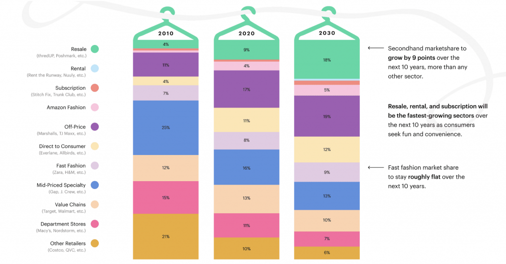 In addition to increases in the resale space, ThredUp points out the growth of secondhand consumption versus that of fast fashion, noting that as of 2020, secondhand apparel was already growing faster in terms of amassing market share than its fast fashion counterparts. “Fast fashion market share is expected to stay roughly flat over the next 10 years,” at roughly 9 percent, while the secondhand clothing segment is slated to grow to 18 percent by 2030, double that fast fashion. Meanwhile, off-price retailers, such as Marshalls and T.J. Maxx, are expected to take 19 percent of the apparel market by 2030, and the likes of subscription apparel services, direct-to-consumer brands, and Amazon’s fashion division are also expected to advance over that same period of time.