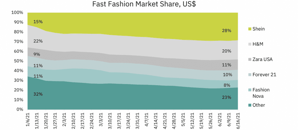 In terms of what that demand looks like, data consultancy Earnest Research puts it ahead of the likes of traditional fast fashion entities, such as H&M, Zara, Forever 21, ASOS, and Topshop, as well as even faster fashion names like Fashion Nova, Boohoo, Missguided, and PrettyLittleThing in terms of market share in the U.S., noting that the U.S. fast fashion market as a whole grew by 15 percent between January and mid-June 2021. According to New York-based Earnest’s data, Shein grew nearly 160 percent during that same period, which suggests that, among other things, “the brand’s mobile-first strategy has resonated with the post-Covid consumer.”