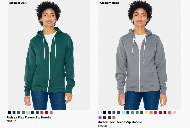As noted by Quartz, “Shoppers can choose between two nearly identical versions of eight of American Apparel’s signature basics, such as hoodies and t-shirts. Presented side-by-side, one version is made in the US, and the other is made outside the US. Shoppers can pick which origin they prefer, but there’s a catch: The US-made products are anywhere from about 17% to 26% more expensive.”