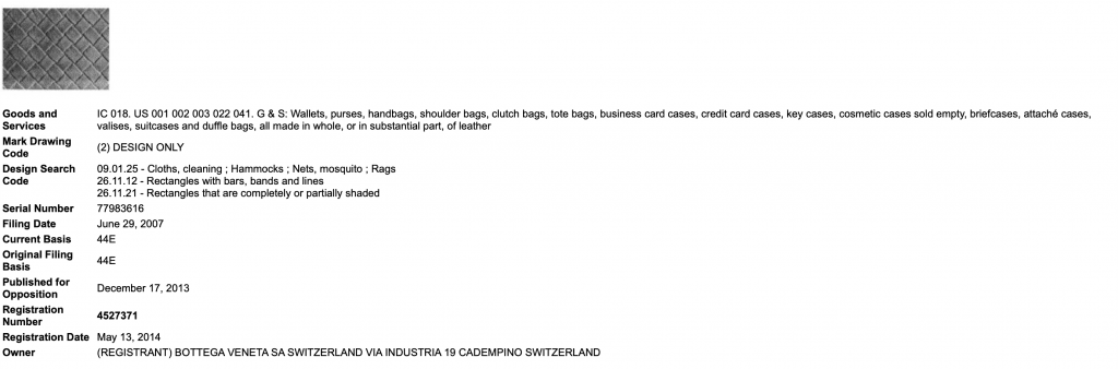 One place where we have seen some action testing the strength of the intrecciato weave mark is on the footwear front – albeit not from Bottega, but in the form of a successful opposition from footwear brand Marc Fisher, which sought to block the application filed by Bottega back in 2007 (Ser. No. 77219184) for the same intrecciato weave for use on footwear. Marc Fisher argued – and the TTAB agreed in June 2019 – that Bottega’s mark for use on footwear was merely ornamental and that the brand had failed to establish acquired distinctiveness.