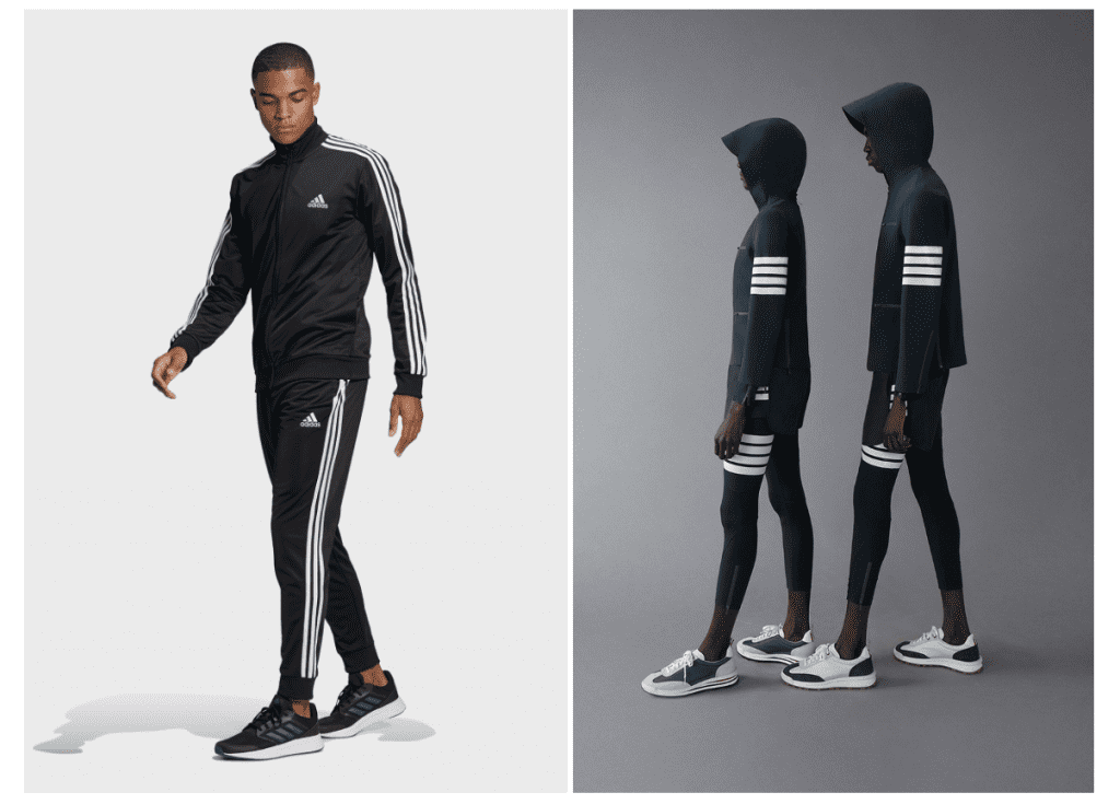 Setting the stage for the now-completed trademark trial, adidas filed a trademark infringement and dilution suit against Thom Browne in June 2021. The German sportswear giant – which has been using a 3-stripe logo since the 1950s and is notoriously litigious when it comes to others’ use of lookalike marks – alleged that Browne was engaging in “direct competition with [it] by offering sportswear and athletic-styled footwear that bears confusingly similar imitations” of its three stripes.
