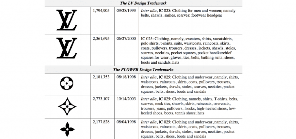 Faced with such a counterfeit bag, Louis Vuitton has an array of trademarks upon which it can rely to seek legal recourse. The Toile Monogram, alone, consists of at least a handful of different trademarks – from each of the distinct flower motifs and little LV logo to the entirety of the monogram, itself. The luxury goods giant maintains rights and has registrations for each of these elements, and thus, can make a number of individual trademark claims.