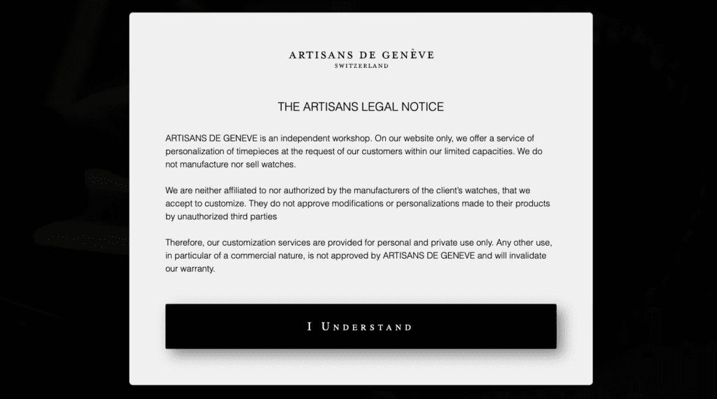 And in one more bit of background worth noting, the defendant does business via its e-commerce site, which requires consumers to acknowledge a disclaimer that states that it: (1) is an independent atelier offering watch customization services at the request of customers for private use; (2) does not manufacture or sell watches; and (3) is not affiliated with or authorized by any of the underlying watch manufacturers.