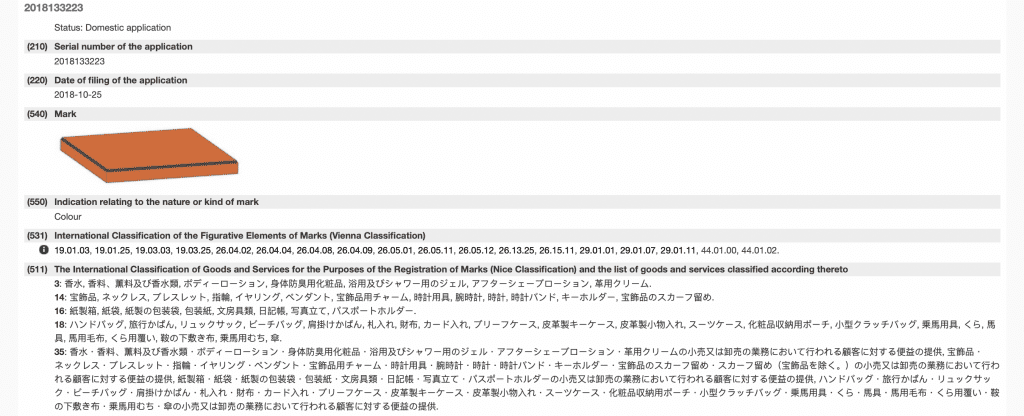 The appeal from Hermès follows from its unsuccessful argument that the combination of orange and brown on product packaging has acquired distinctiveness in the minds of relevant consumers, making it so that they associate the colored product packaging with the Hermès brand. In furtherance of its argument, counsel for Hermès stated that the brand has been consistently using the color combination on its product packaging in Japan since the 1960s and cited survey evidence that it conducted among “high-income men and women in their 30s to 50s” with incomes of JPY10,000,000 ($87,951.91) and above that shows that a portion of consumers link the colored packaging to the Hermès brand.