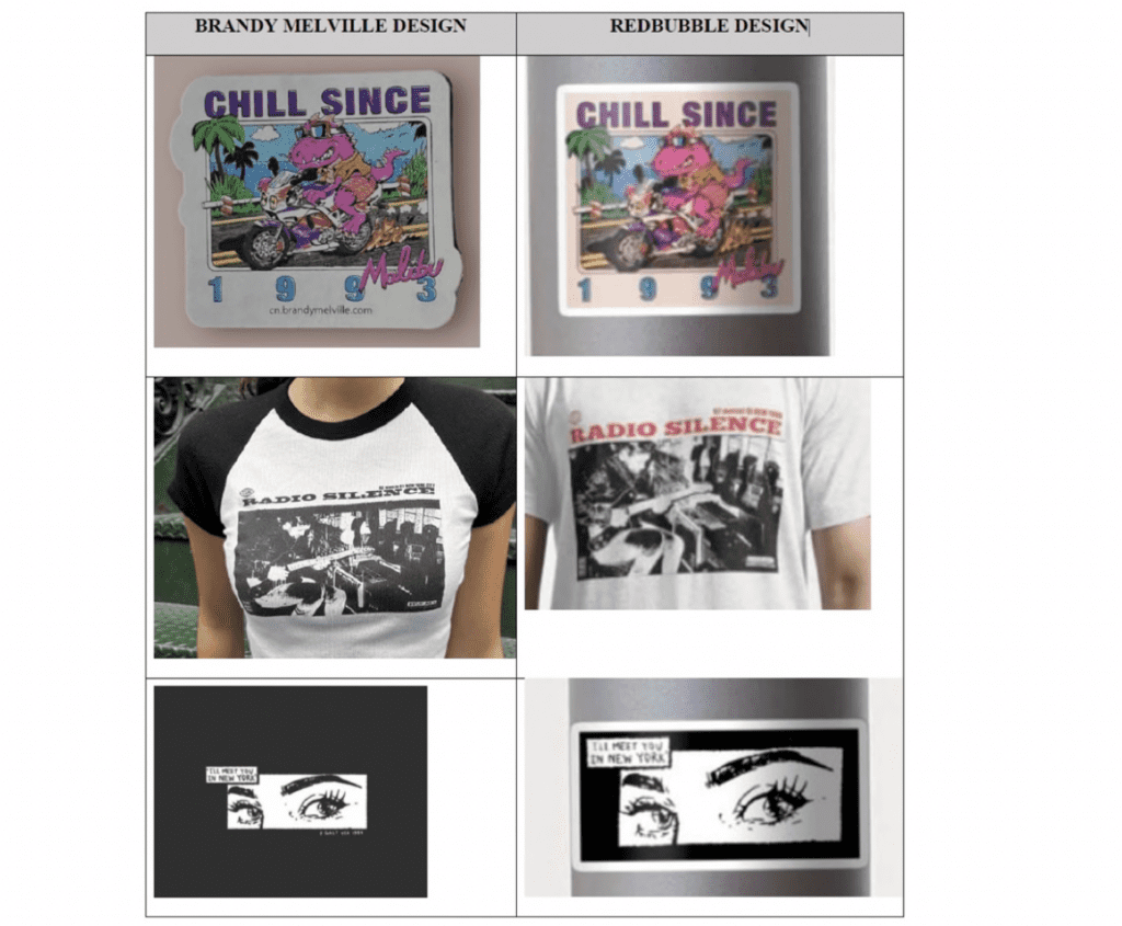 The retailer is seeking injunctive relief to bar Redbubble and those acting in concert with it from “designing, manufacturing, importing, shipping, delivering, selling, marketing, displaying, advertising, or promoting any product that incorporates or is marketed in conjunction with” any Brandy Melville trademark or copyright, among other things. It is also angling for monetary damages, including but not limited to an award of all of the profits that Redbubble generated from its allegedly infringing acts, statutory damages of no less than $150,000 per registered copyright and no less than $2 million per registered trademark, etc.