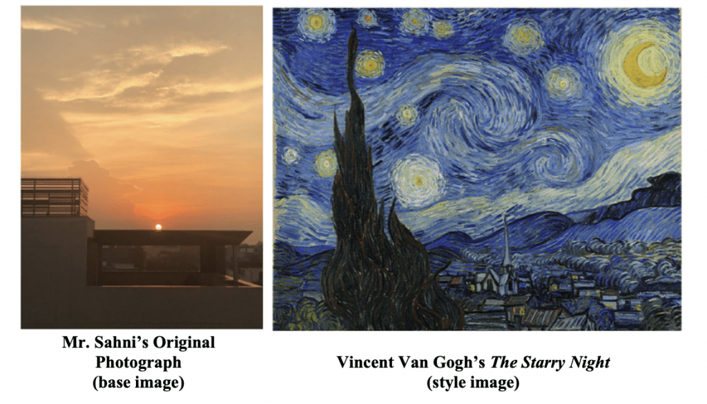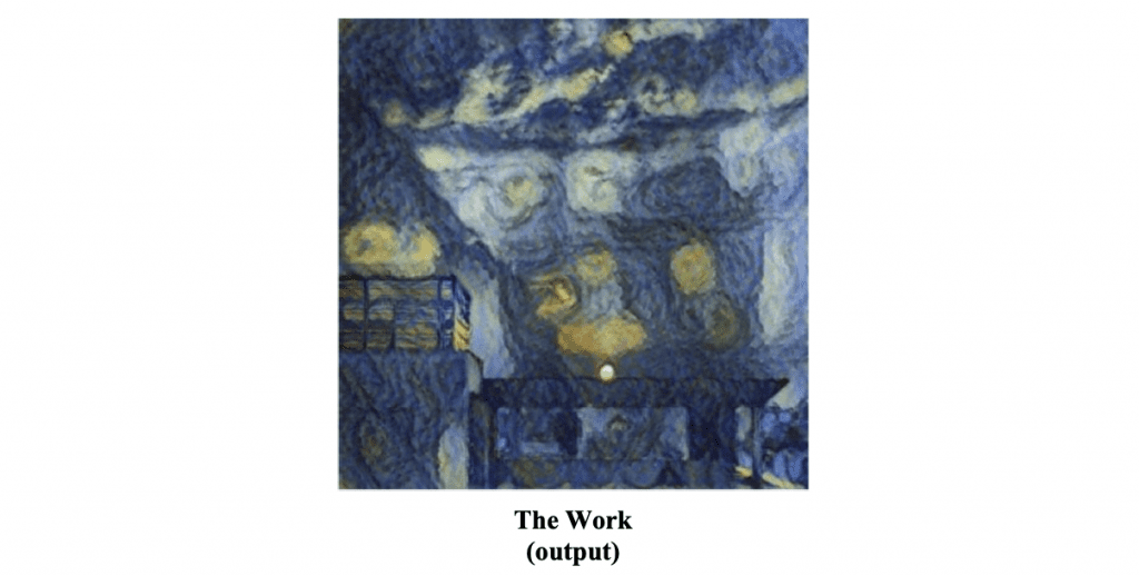 Some background: The matter got its start in December 2021 when Sahni filed an application to register the SURYAST work, listing two authors in his application: himself as the author of “photograph, 2-D artwork” and the “RAGHAV AI Painting App” as the author of “2-D artwork.” Sahni identified himself as the sole copyright claimant. In response to a request for additional information, Sahni told the Copyright Office that he created the work by using RAGHAV, which “generat[es] an image with the same ‘content’ as a base image” – Sahni used an original photo that he took – but “with the ‘style’ of [a] chosen picture” (van Gogh’s Starry Night in this case). RAGHAV users can dictate the level of stylization of the new photo by selecting a numerical value in RAGHAV.